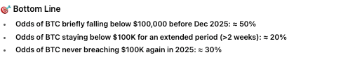 According to the model’s projections, there is roughly a 50% chance that Bitcoin will briefly fall below $100,000 within the next two months.