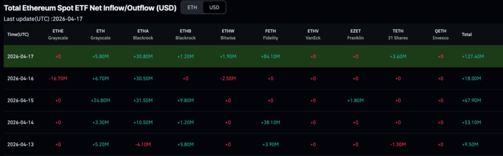 ETHA led the flows, contributing $30.8 million on April 17 and maintaining similar levels on April 16 and April 15, with $30.5 million and $31.5 million, respectively.Β