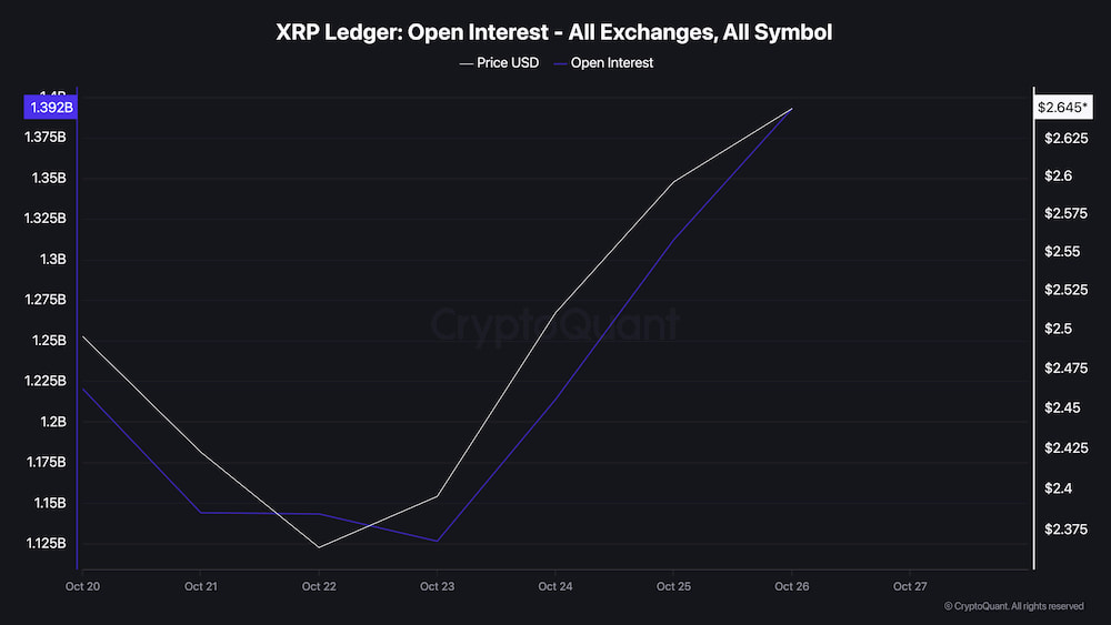 XRP ledger open interest 1-month chart. Source: CryptoQuantXRP open interest recovered to about $1.39 billion as of October 26, the token’s price also bounced while leverage did not, which tells you spot demand steadied first and spec came back second.