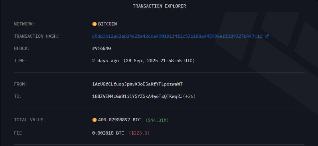 A long-silent Bitcoin wallet woke up this week and emptied roughly 400 BTC into several new addresses. According to blockchain trackers, the address sent its coins in multiple transactions, mostly split into batches of 15 BTC. The total value moved is roughly $44 million, based on current prices.