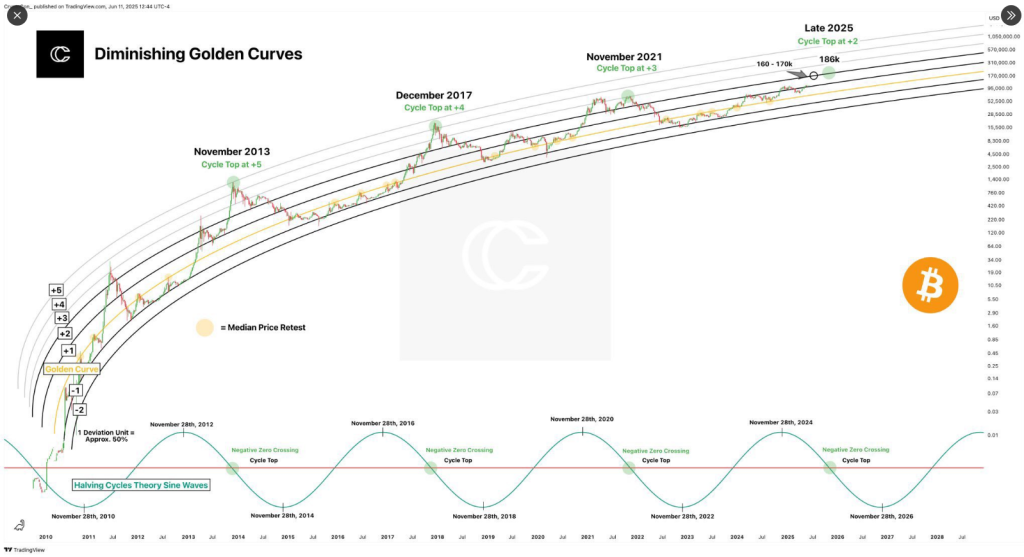 Based on reports from CryptoCon, a model called diminishing golden curves maps price bands using logarithmic regression. The model tracks how far Bitcoin moves above a “Golden Curve” growth path and labels those moves with deviation levels.