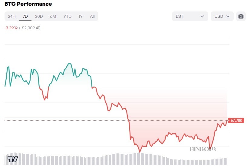 BTC/USD 7-day performance. Source: FinboldAs whale selling pressure intensified across the market, BTC failed repeatedly to breach the resistance zone around $71,000 over the past several weeks. The coin subsequently dropped 3.29% over the past seven days, trading near $67,780 at press time.