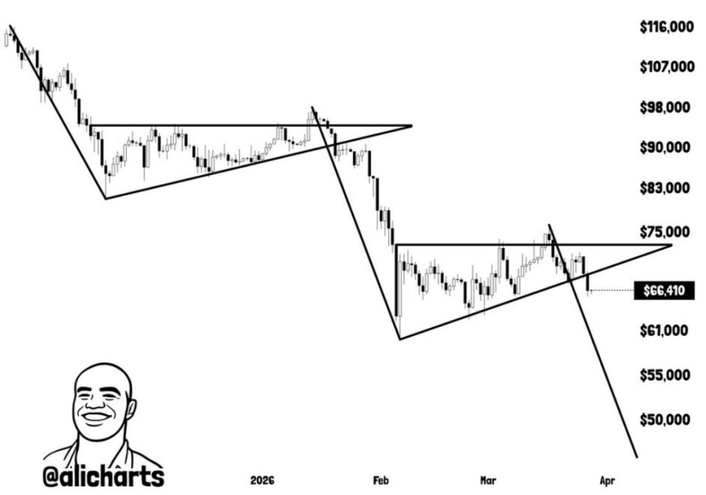 BTC daily chart. Source: alichartsThe renewed selling pressure has raised the odds of a capitulation event similar to Bitcoin’s sharp drawdown in February 2026, according to analysis trading expert Ali Martinez. Martinez also noted that BTC has been forming a descending triangle over the past two months – a classically bearish pattern characterized by a declining resistance line and a relatively flat support floor – which, combined with rising whale distributions, compounds the downside risk.