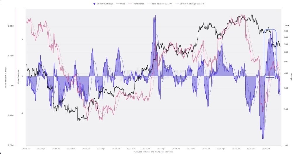 Bitcoin exchange whale ratio for 12 months. Source: CryptoQuantThe heightened selling pressure from Bitcoin whales is also supported by the negative phase of its whale 30-day % change, a metric that tracks whether large-wallet holders are growing or shrinking their BTC stockpiles over time. After aggressive accumulation at the start of the year, this indicator turned negative in March, indicating that whales have shifted from buying to distributing.
