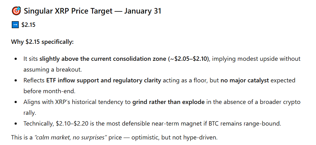 ChatGPT forecasts XRP price target for January 31. Source: Finbold & ChatGPTAccording to ChatGPT, such a level fits best into a model that assumes no major shocks and is in line with what the LLM described as XRP’s tendency to ‘grind rather than explode.’