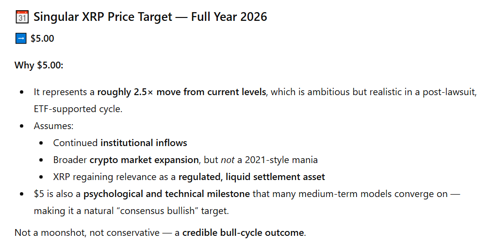 ChatGPT forecasts XRP price target for 2026. Source: Finbold & ChatGPTIn a nutshell, the model explained that the prediction is largely based on the recent positivity in the cryptocurrency market, as well as on the positive developments pertaining to XRP itself, explicitly describing the price target as ‘not a moonshot, not conservative — a credible bull-cycle outcome.’