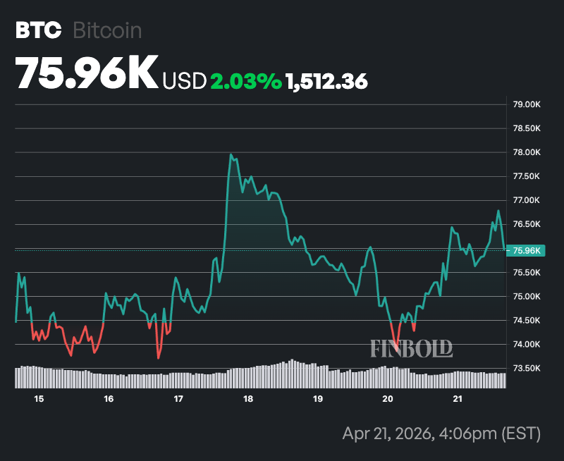 By press time, Bitcoin was trading at $75,964, up about 1% over the past 24 hours, while on the weekly timeframe, BTC has gained 2%.