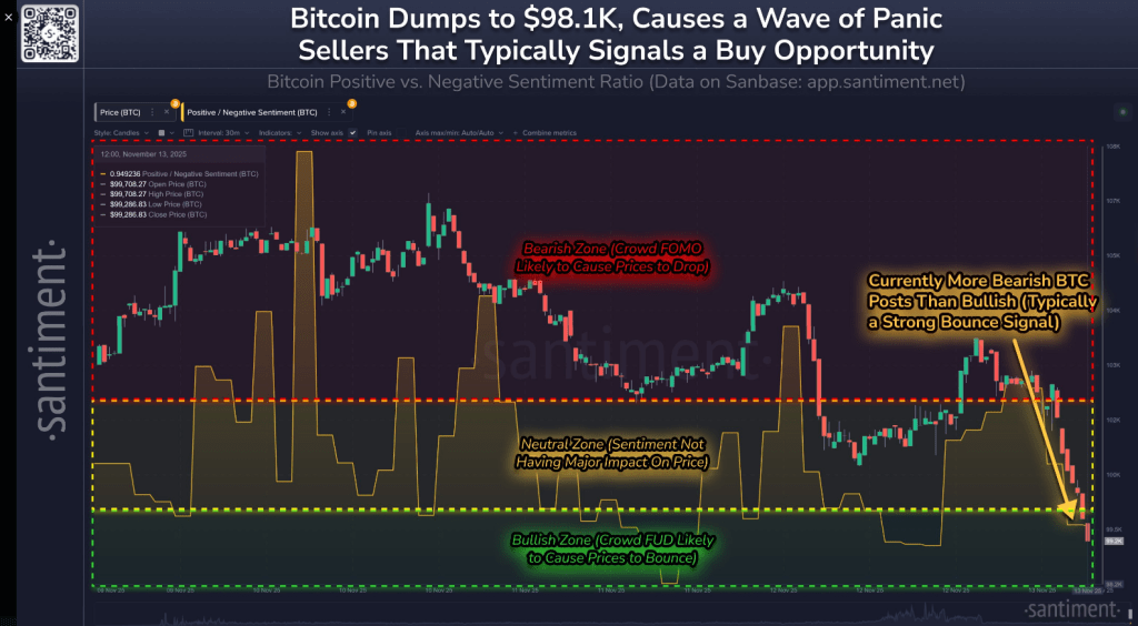 According to Santiment, Bitcoin has fallen below $100K for the second time this month, triggering a burst of fear and worried posts from retail traders.