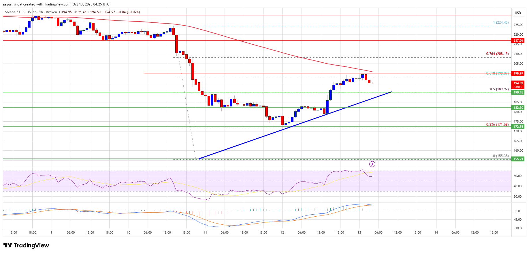 If SOL fails to rise above the $200 resistance, it could start another decline. Initial support on the downside is near the $190 zone and the trend line. The first major support is near the $182 level.