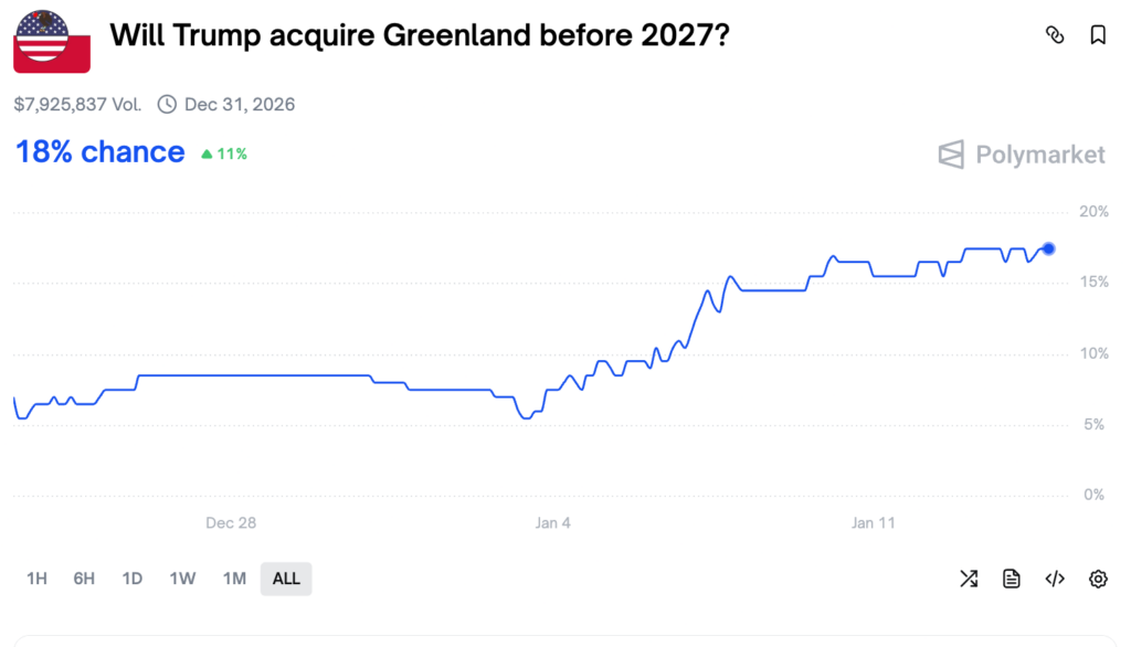That shift appears to be mirrored in the recent uptick in Greenland market odds. At the same time, Greenland’s government and Denmark have firmly rejected any sale or transfer of sovereignty, and no formal diplomatic process exists to support an acquisition.